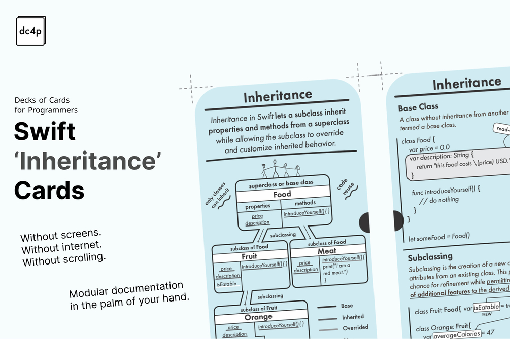 You'll get 3 cards to print about "Inheritance" in Swift. Valuable information in the palm of your hand.