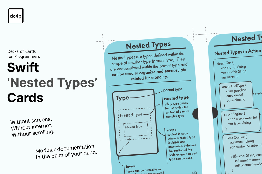 You'll get three cards to print about "Nested Types" in Swift. Valuable information in the palm of your hand.